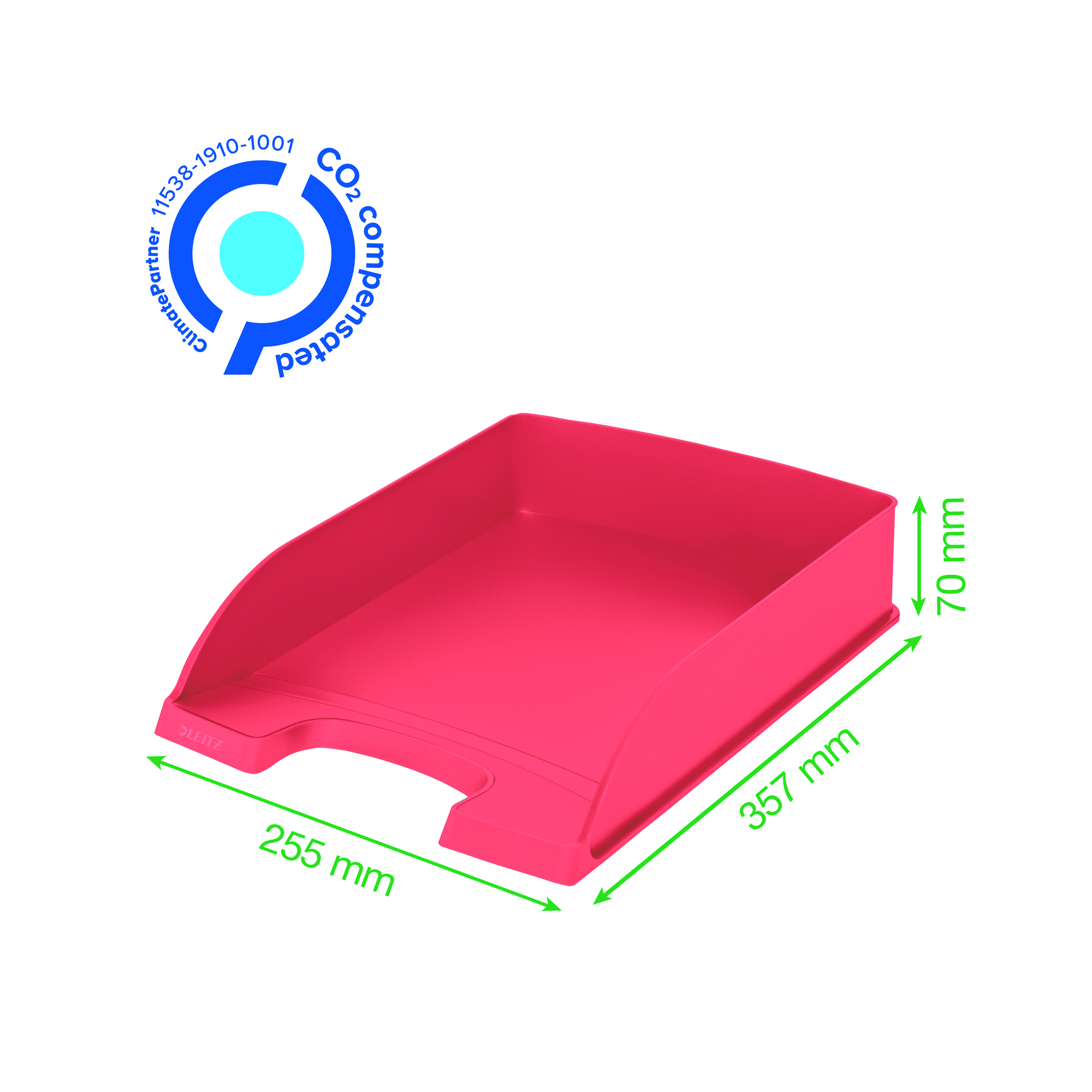 Eye-catching, premium quality Letter Tray made min. 90% post consumer recycled plastic suitable for A4. 100% recyclable and with Blue Angel environmental certification. This robust paper tray perfectly complements other products from the Leitz Recycle range and is made to last. Modern and contemporary green stationery that will look great at home and in the office. With the eco friendly Recycle range from Leitz you can both improve your office environment – and the environment of our planet.